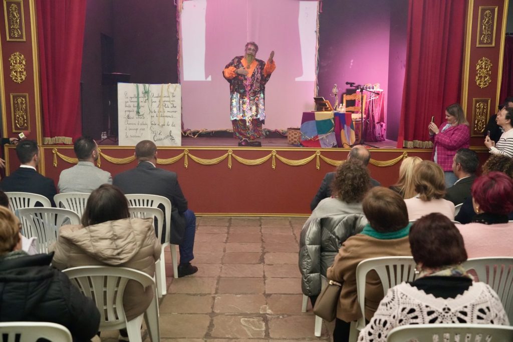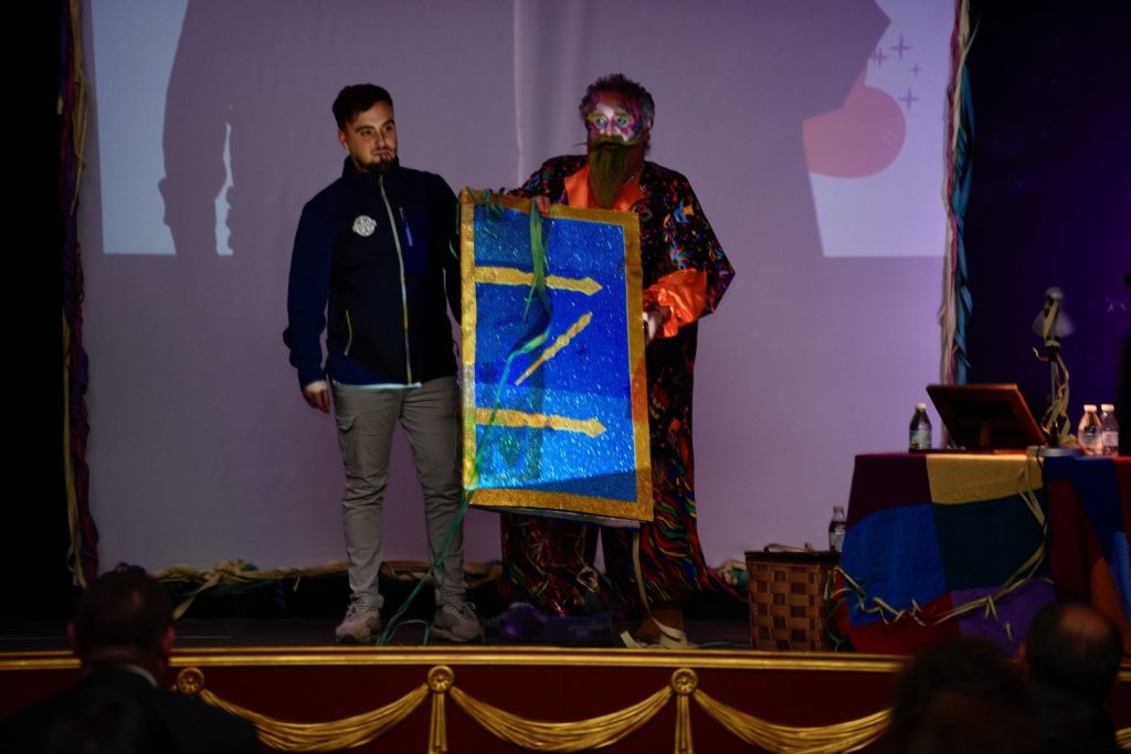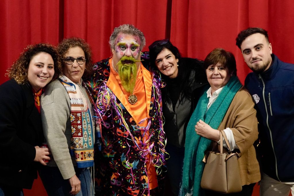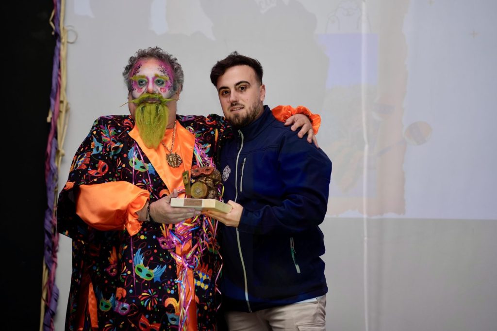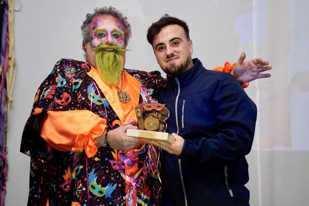 Al finalizar el pregón, su propio hijo y socio de la asociación carnavalera barreña, Alberto Ortega, le entregó la escultura representativa de la entidad, la Montera del Torero con más mascara y adornos carnaveleros