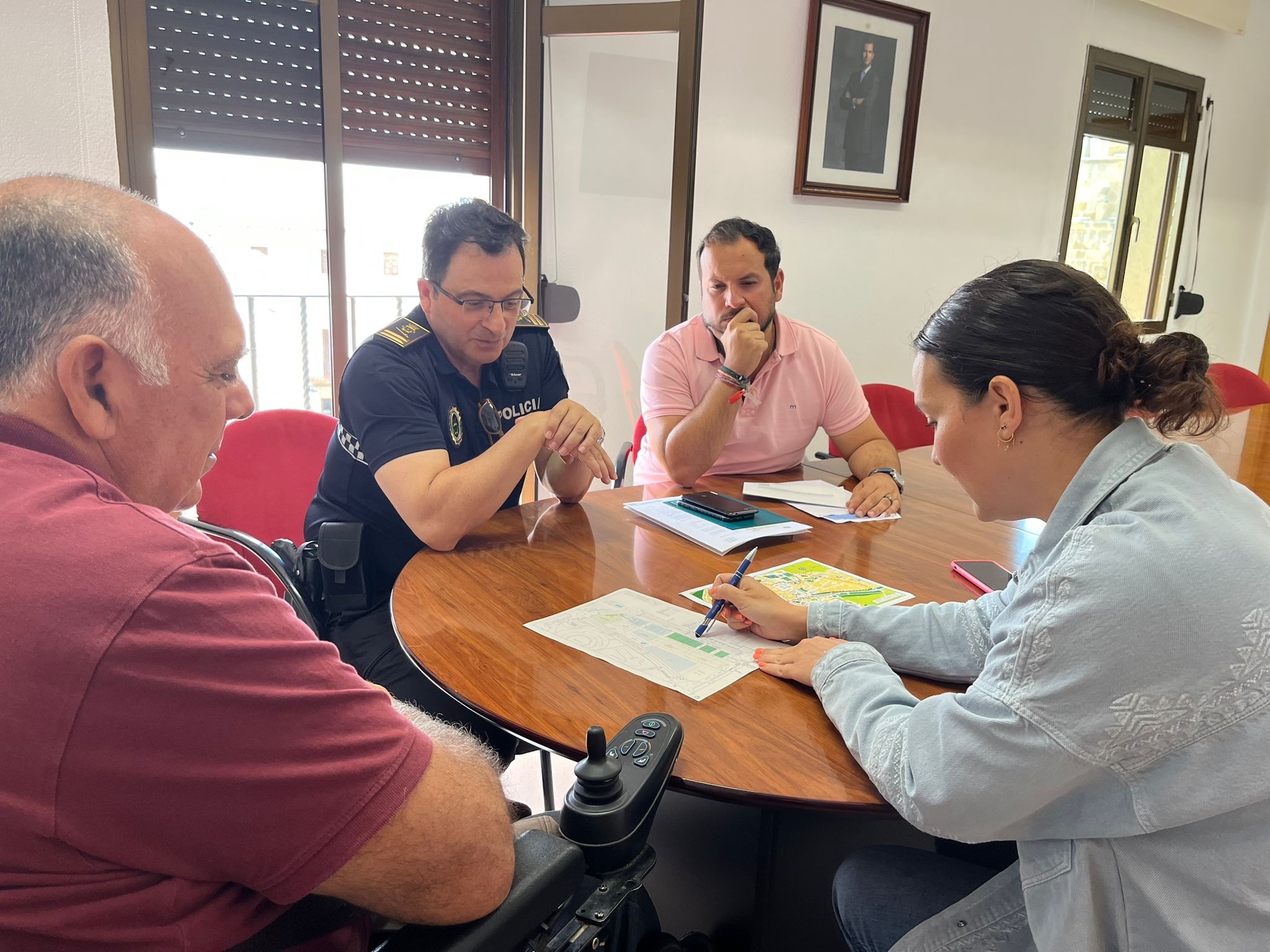 La delegada de Servicios Sociales, Sara Lobato, y el delegado de Festejos, Daniel Pérez Cumbre, han mantenido una reunión de coordinación con el jefe de la Policía Local, José Viaga, y con el presidente de la Asociación de Discapacitados ‘La Montera’, Juan Antonio Muñoz, para establecer los puntos donde se situarán las plazas de aparcamiento para personas con movilidad reducida en las inmediaciones del recinto ferial durante las próximas fiestas patronales, que se celebrarán del 13 al 20 de mayo.