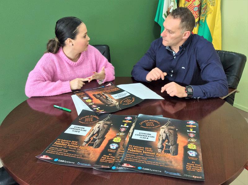 La delegada de Deportes del Ayuntamiento de Los Barrios, Sara Lobato, y el presidente del Club Team Mairena, Juan Mairena, han formalizado esta mañana en Alcaldía la firma del convenio de colaboración entre el Ayuntamiento y los clubes Team Mairena y Don Príncipe para la realización este sábado 3 de febrero del I Circuito Andaluz de Kick Boxing UND-ISKA en el pabellón Samuel Aguilar, clasificatorio para los Campeonatos Nacionales.