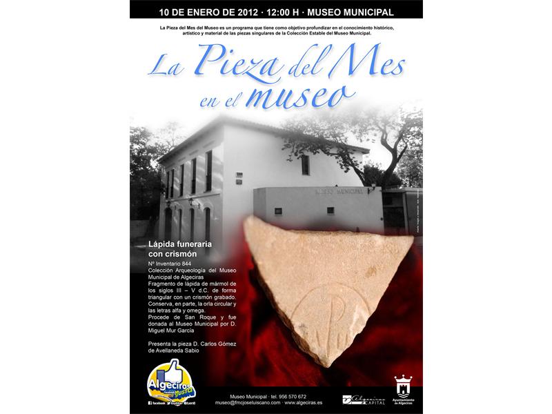 En esta ocasión se trata de una pieza que corresponde a un fragmento de lápida funeraria con crismón, elaborada sobre mármol, datada entre los siglos III – V después de Cristo, hallada en San Roque y donada al Museo Municipal por Miguel Mur.