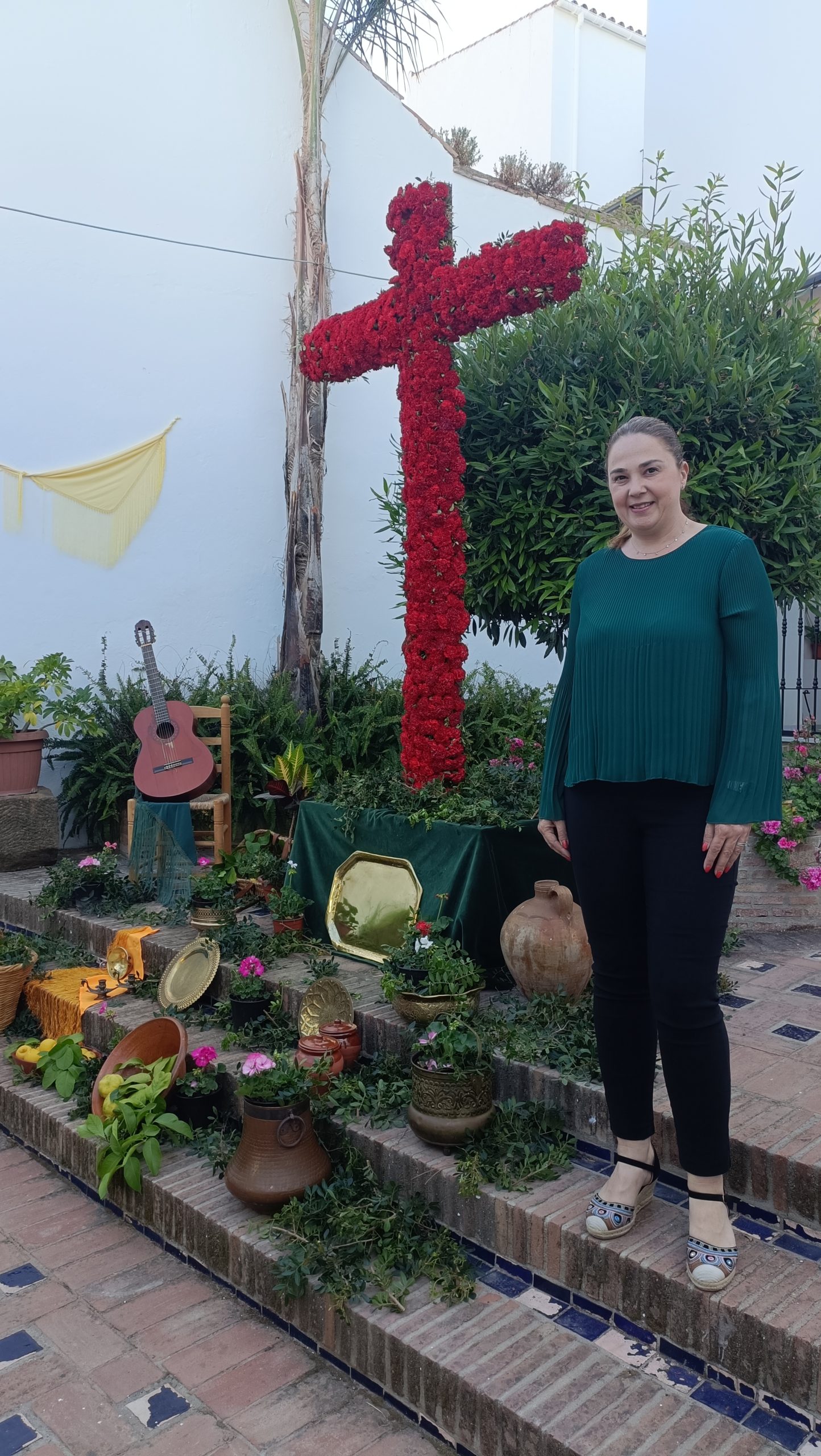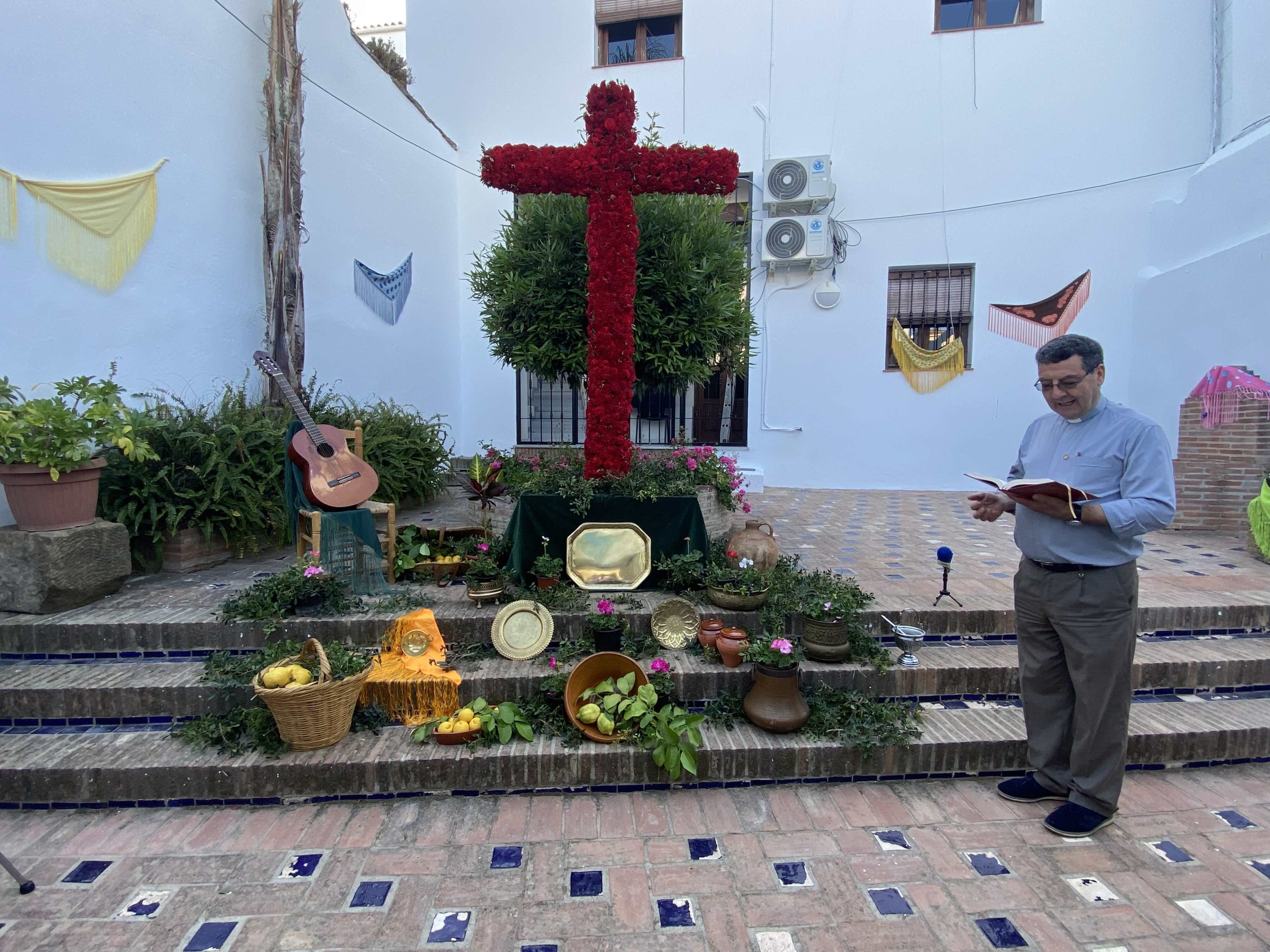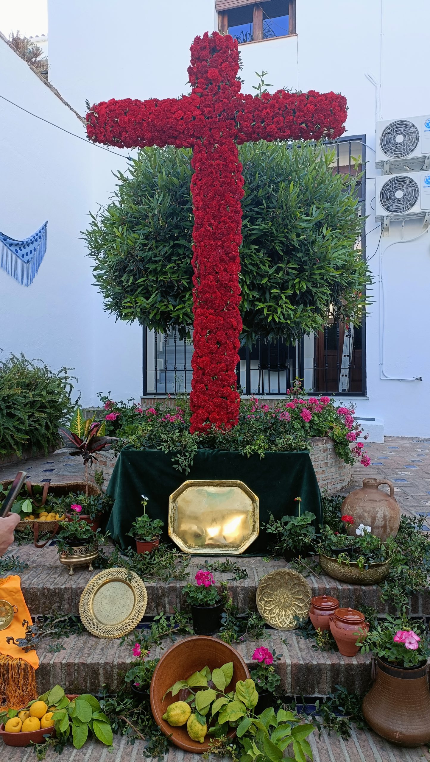 Para ello, una gran cruz revestida de flores rojas y acompañada de varios exvotos, así como sencillos ornamentos, ha sido alzada en el mencionado espacio de este emblemático e histórico edificio de la villa y permanecerá allí expuesta hasta el próximo día 12.