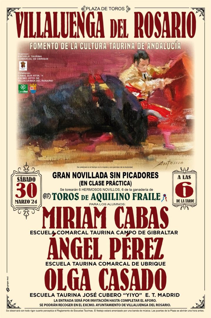 Se lidiarán reses de la ganadería de Aquilino Fraile para los alumnos Miriam Cabas (Escuela Taurina Comarcal del Campo de Gibraltar), Ángel Pérez (Escuela Taurina Comarcal de Ubrique) y Olga Casado (Escuela de Tauromaquia José Cubero “Yiyo” de Madrid).