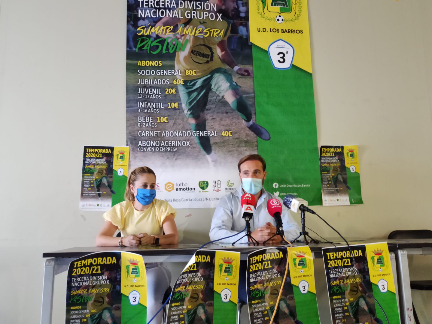 El presidente de la Unión Deportiva Los Barrios y la concejala de Deportes del Ayuntamiento de Los Barrios, Álvaro Moya y May Gallego, respectivamente, han presentado esta tarde la campaña para la captación de socios y abonados para la Temporada 2020/21