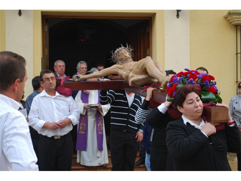La barriada de Los Cortijillos celebró su Vía Crucis recorriendo las calles cercanas a la parroquia de San Juan Bautista de donde partió. El Crucificado, imagen que preside el altar mayor, fue portado a hombros por vecinos y vecinas de la localidad.
