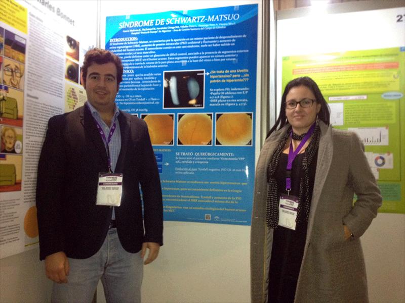 Los autores del póster, los residentes Juan Luis García Madrona, Haj Ismael, María Ángeles Hernández Ortega y Luis Villalba Pinto, además de los oftalmólogos Antonio Domingo Pérez e Ignacio Vinuesa, presentaron un trabajo basado en un caso clínico, concretamente en el caso de un paciente con Síndrome de Schwartz-Matsuo, una rara patología. El Síndrome de Schwartz-Matsuo se caracteriza, entre otros aspectos, por la aparición en un mismo paciente de desprendimiento de retina regmatógeno y el aumento de presión intraocular unilateral. El antecedente común en este raro síndrome suele ser haber sufrido un traumatismo ocular y el sexo masculino.