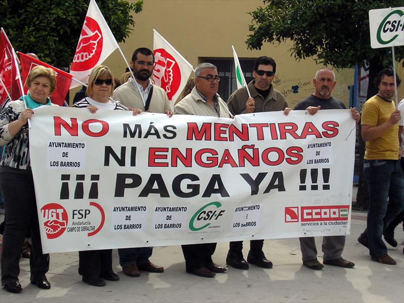 Las secciones sindicales del Ayuntamiento de Los Barrios; UGT, CC.OO y CGT, quieren poner en conocimiento del alcalde, Jorge Romero, su malestar por el impago de la nómina del mes de abril a los trabajadores de las empresas municipales y el resto que se debía a los trabajadores laborales interinos e indefinidos. Foto de archivo.