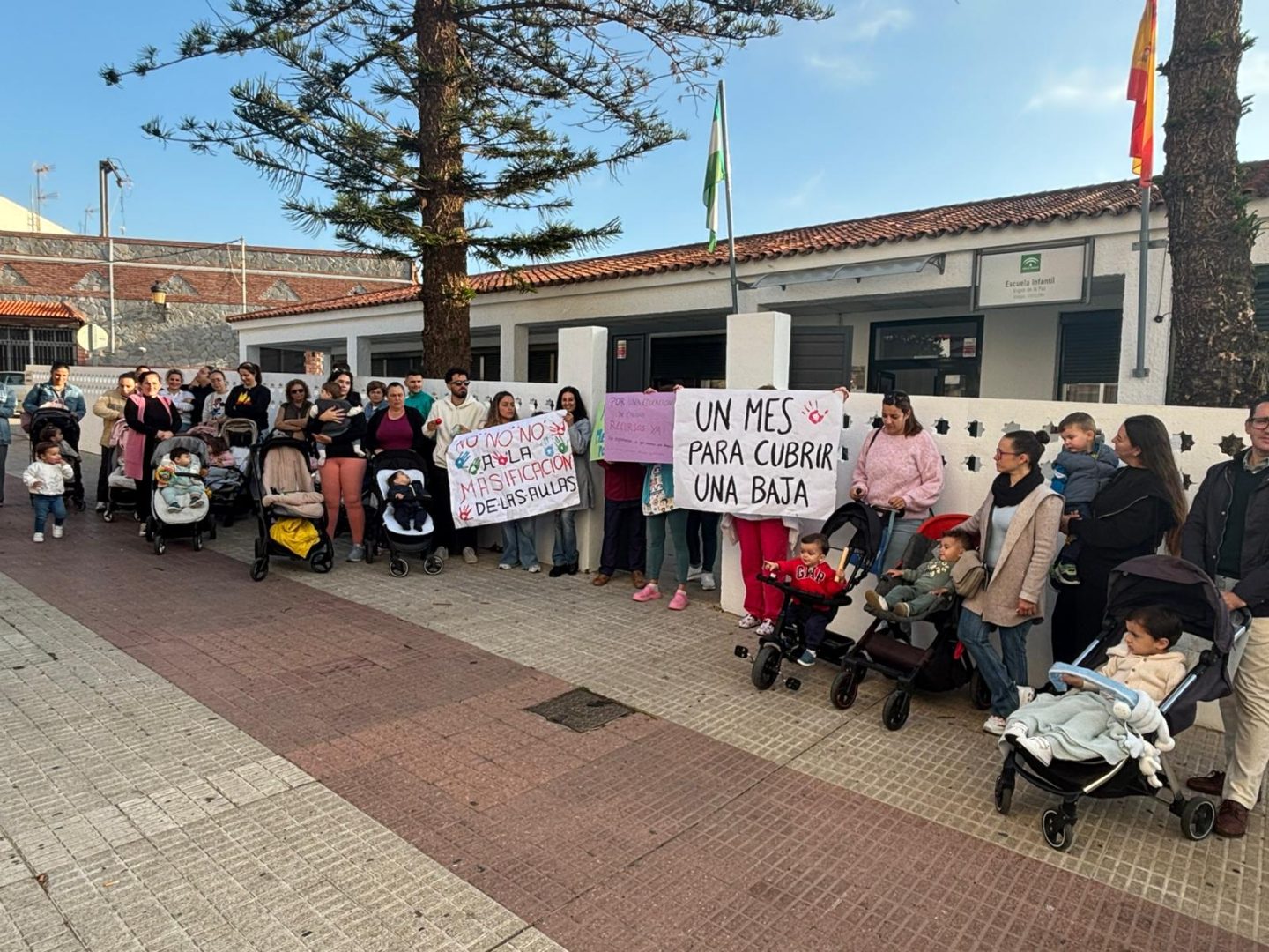 En el lugar de la protesta, familias al completo, algunas con sus hijos en carritos, se concentraron a las puertas de la escuela infantil portando diversas pancartas. Entre los mensajes más destacados figuraban reclamaciones por la “masificación de las aulas” y críticas a la lentitud administrativa para la gestión de ausencias del personal. Una de las pancartas exhibidas resumía la desesperación del sector: “Un mes para cubrir una baja”.