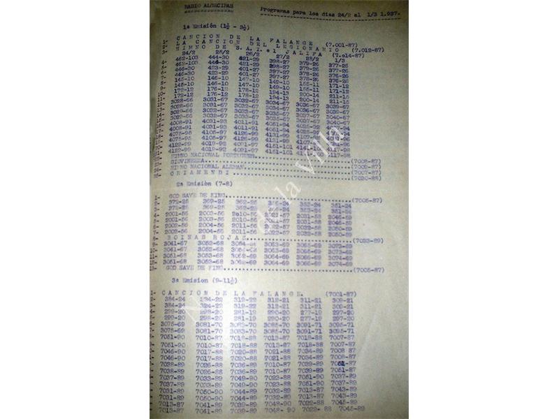 2.- Los discos se radiaban en el orden indicado, que solo se alteraría para intercalar los anuncios, las retransmisiones de Burgos, Salamanca, etc., La charla del General Queipo de Llano y las notas oficiales.