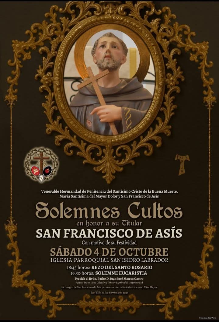 La Venerable Hermandad de Penitencia del Santísimo Cristo de la Buena Muerte, María Santísima del Mayor Dolor y San Francisco de Asís convoca a los fieles a participar en los solemnes cultos en honor a San Francisco de Asís, que tendrán lugar el próximo sábado 4 de octubre en la Iglesia Parroquial de San Isidro Labrador de Los Barrios.