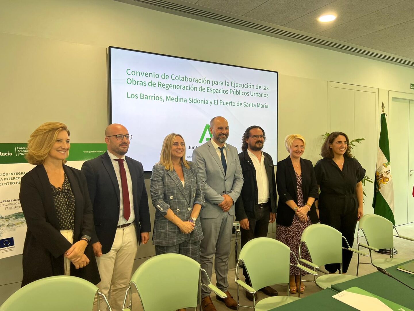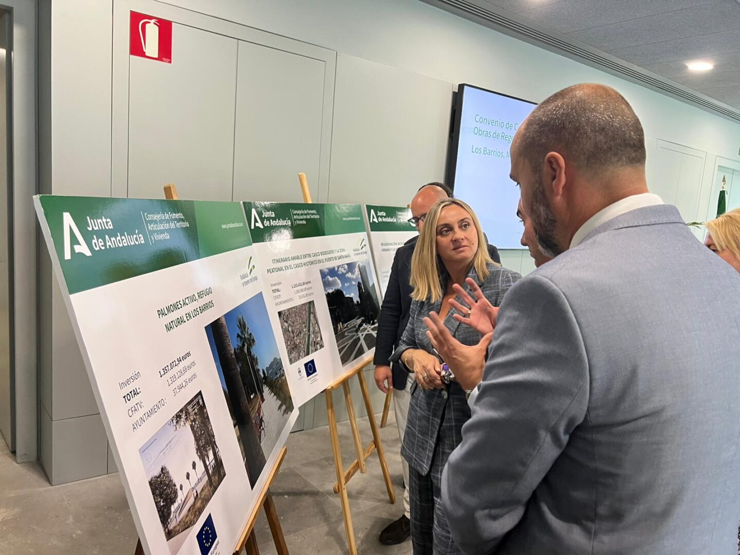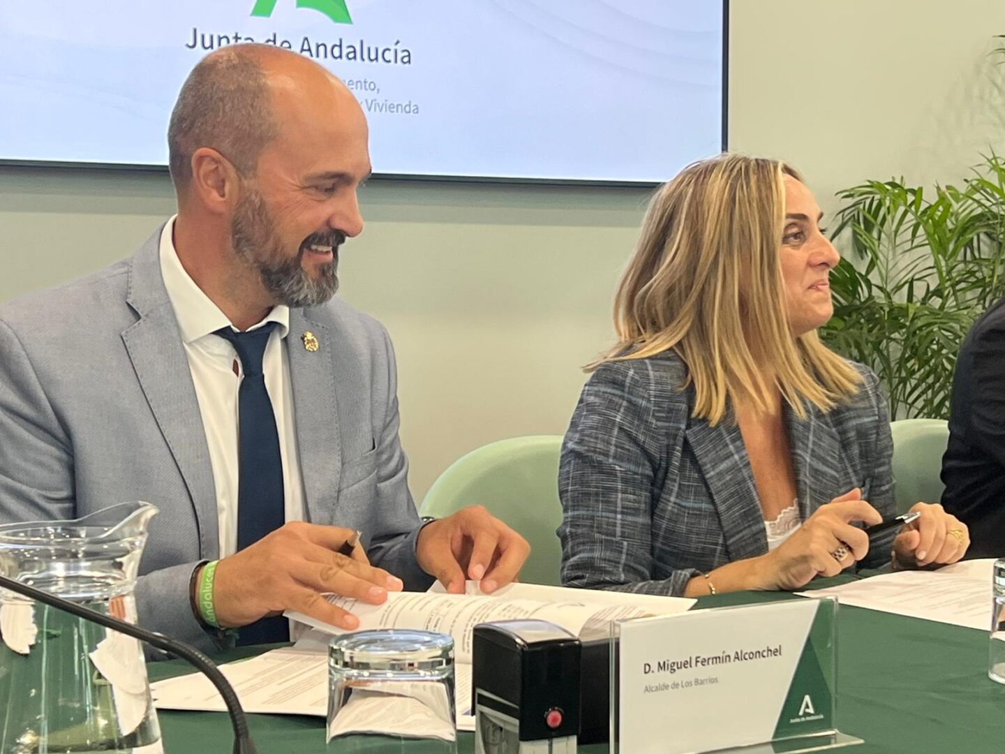 El alcalde de Los Barrios, Miguel Alconchel, ha firmado este mediodía en Sevilla con la consejera de Fomento, Marifrán Carazo, el convenio entre la Consejería de Fomento, Articulación del Territorio y Vivienda y el Ayuntamiento barreño para la ejecución y financiación de las obras de regeneración del espacio verde junto al paseo marítimo de Palmones, denominado el proyecto ‘Palmones Activo, refugio natural’¸ con cargo a la Inversión Territorial Integrada (ITI) de Cádiz. El primer edil ha estado acompañado por el concejal de Urbanismo, Pablo García.