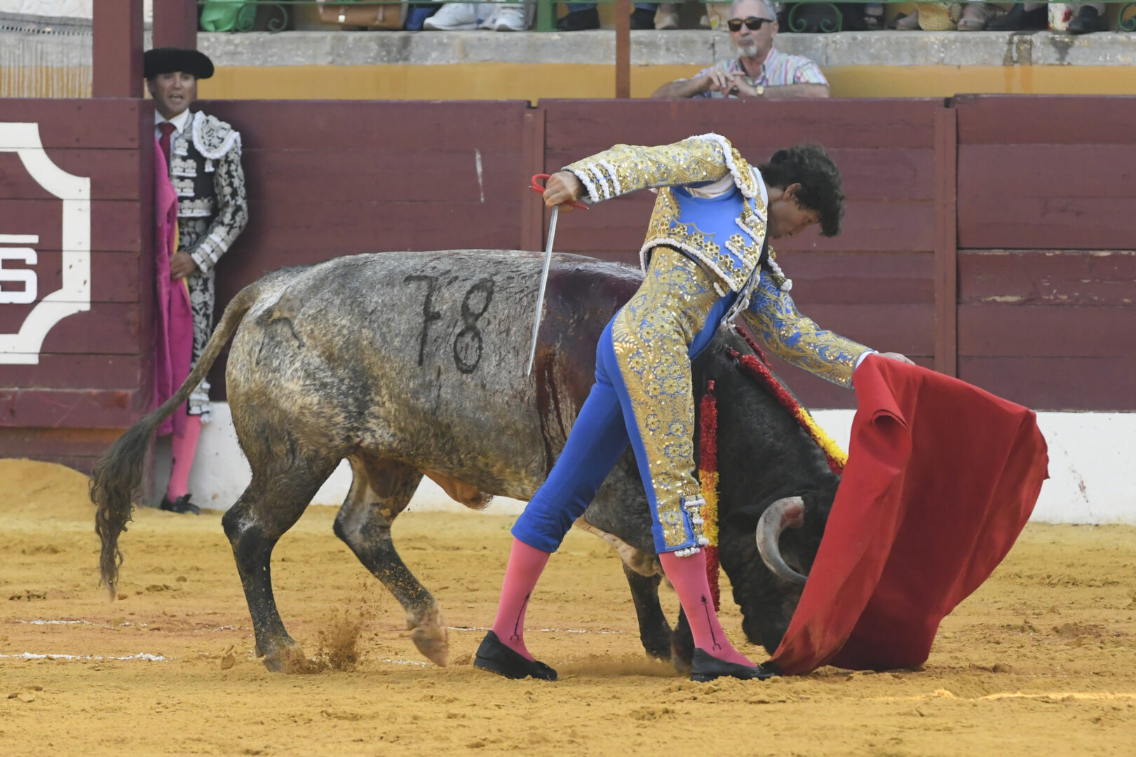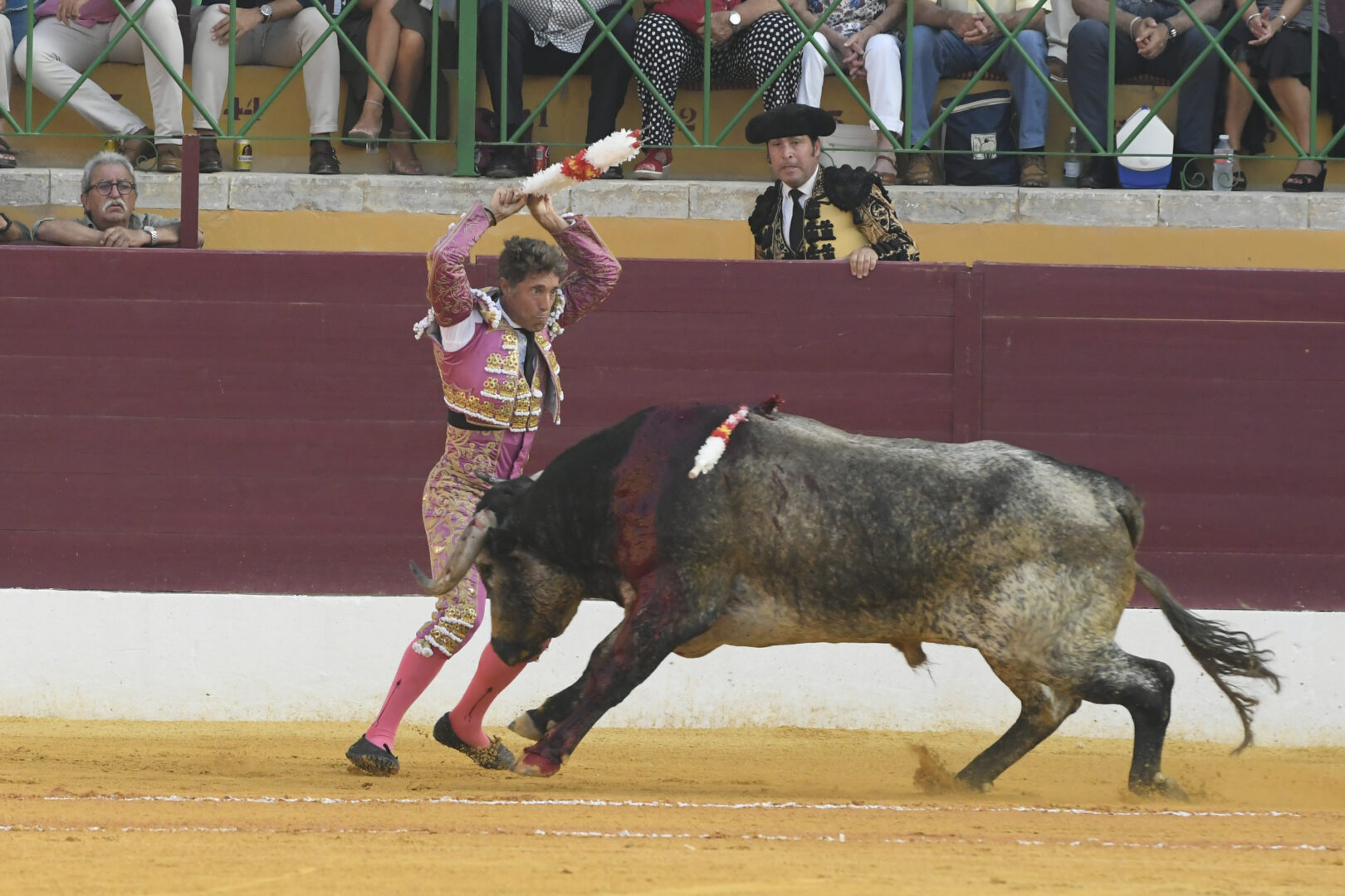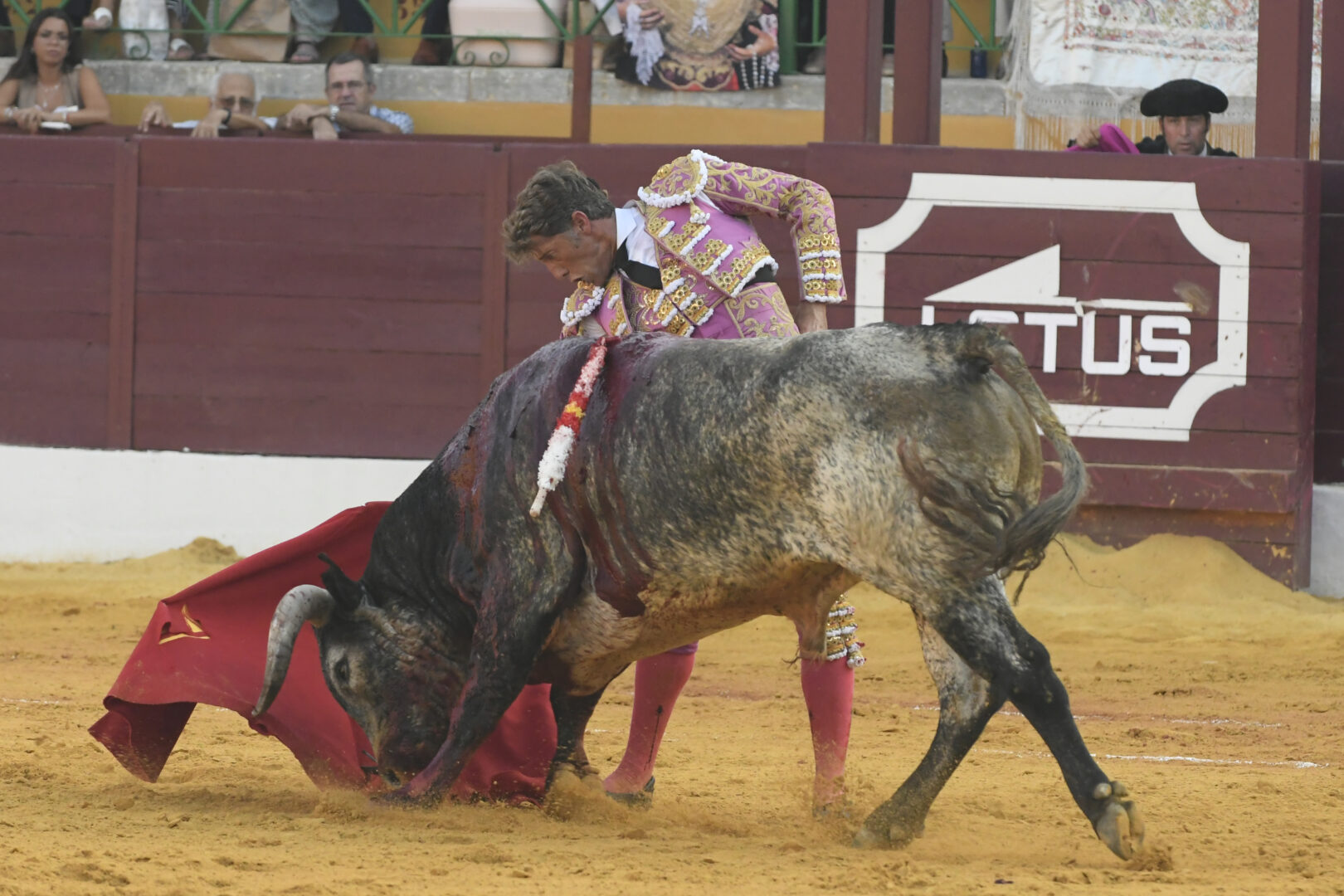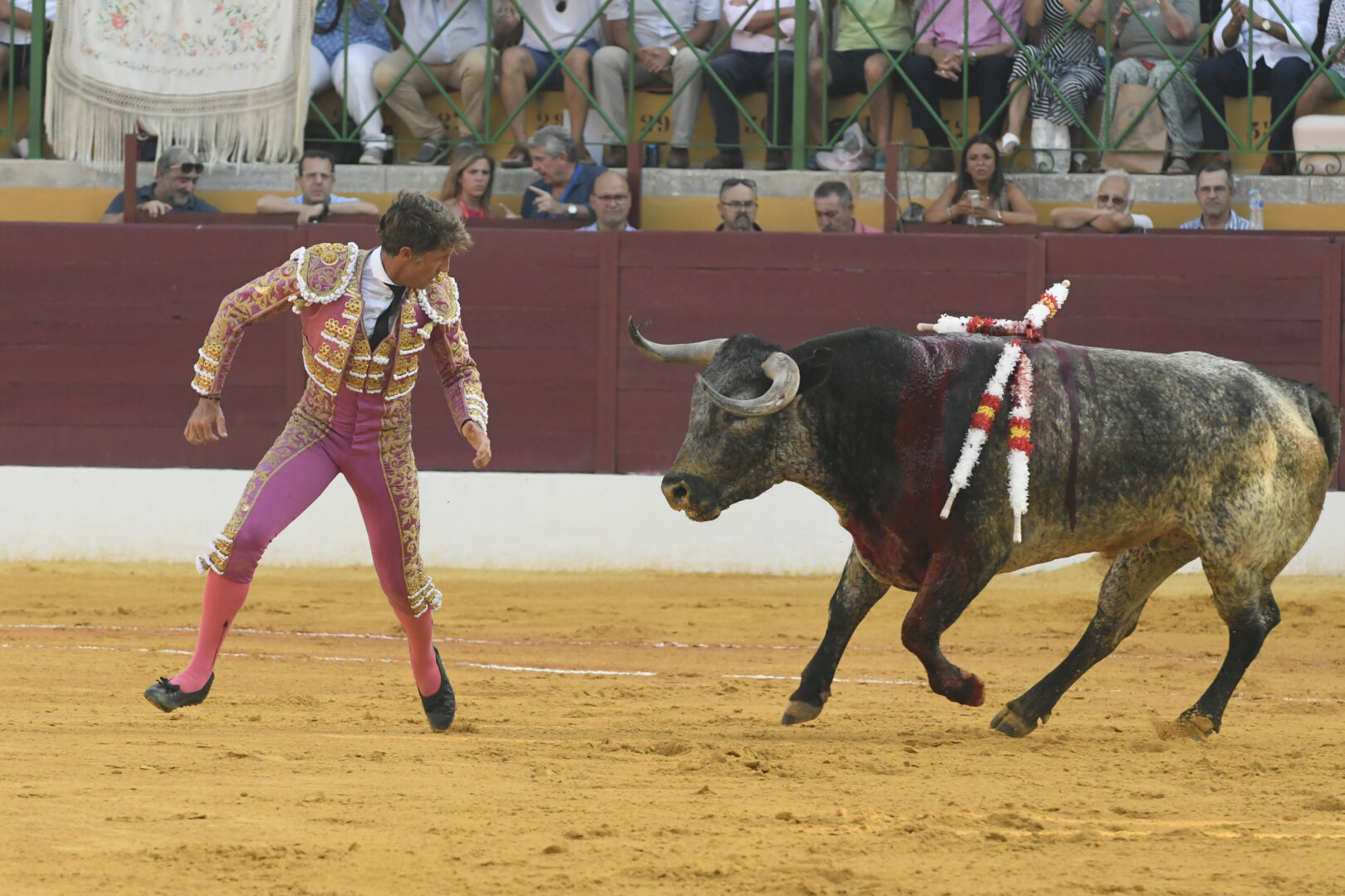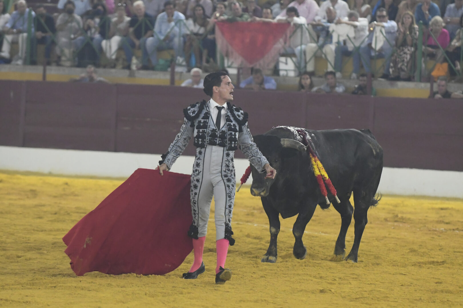 Manuel Escribano, oreja en el único que mató, de carmesí y oro.