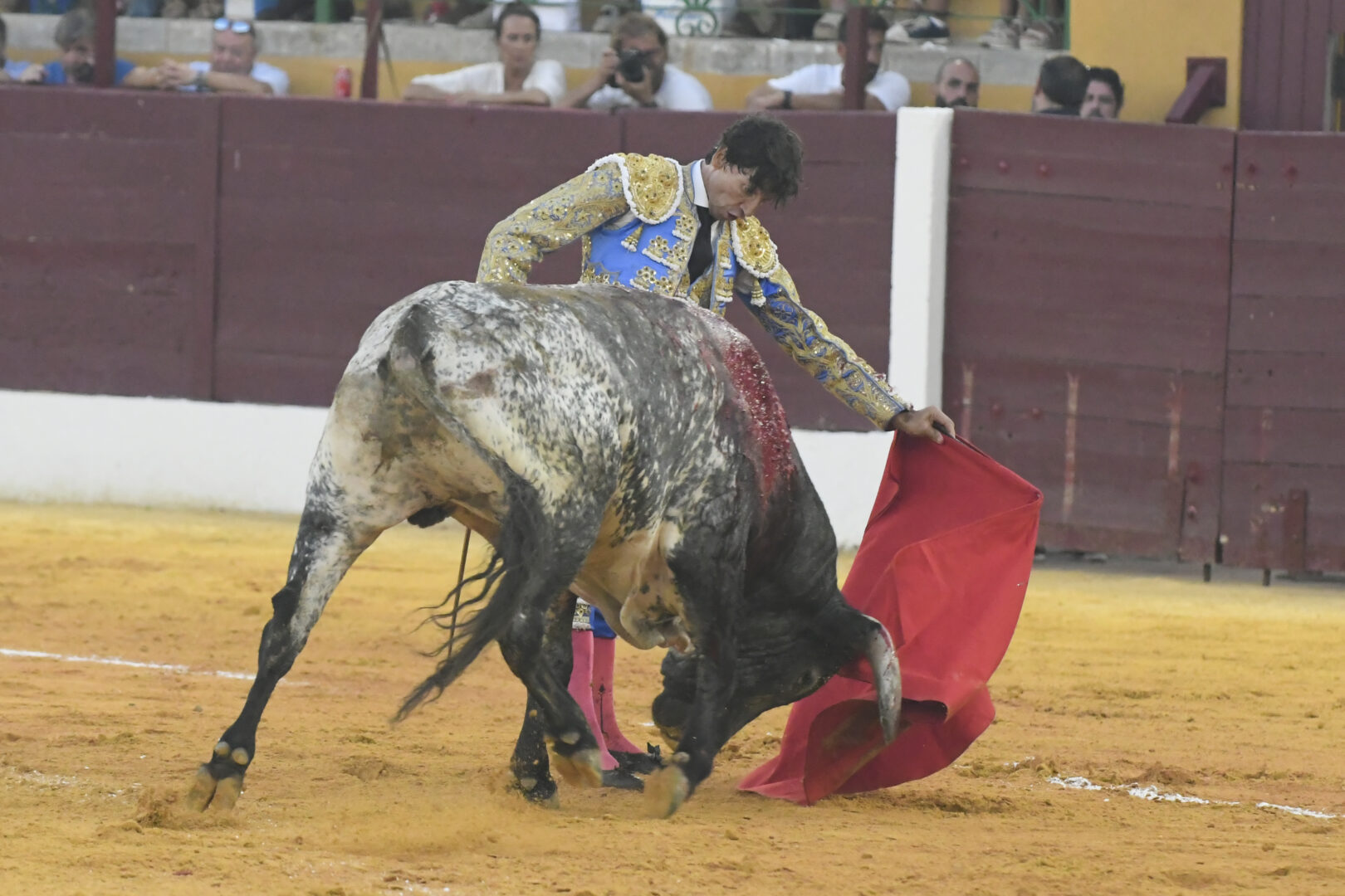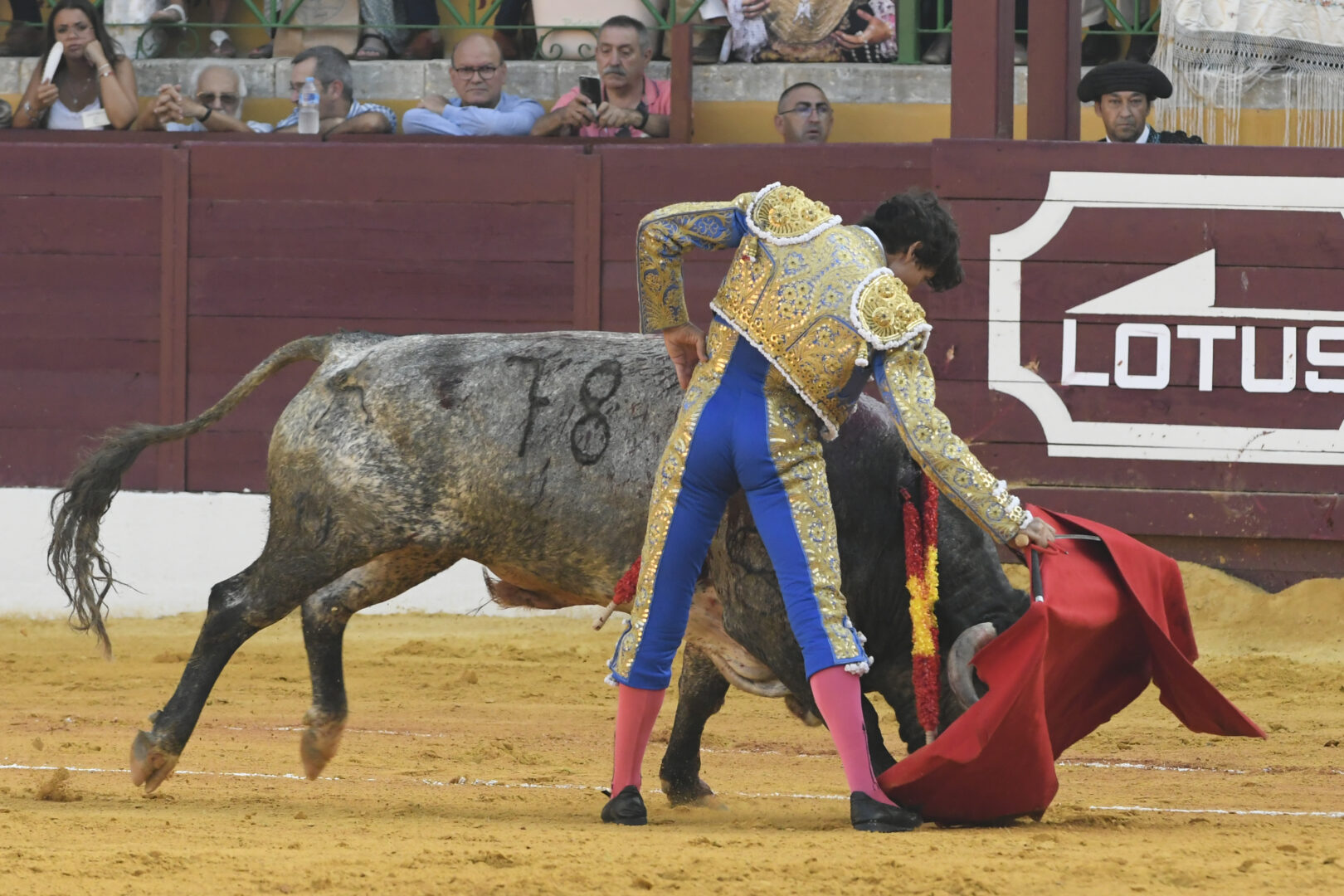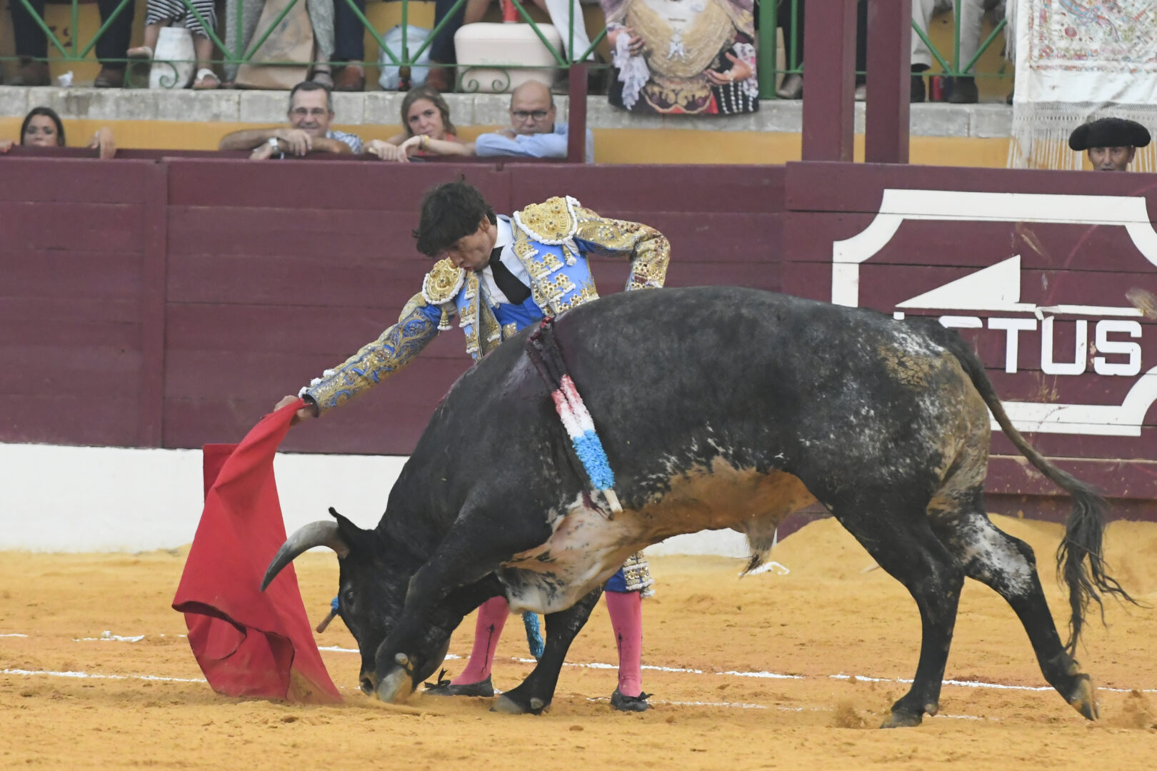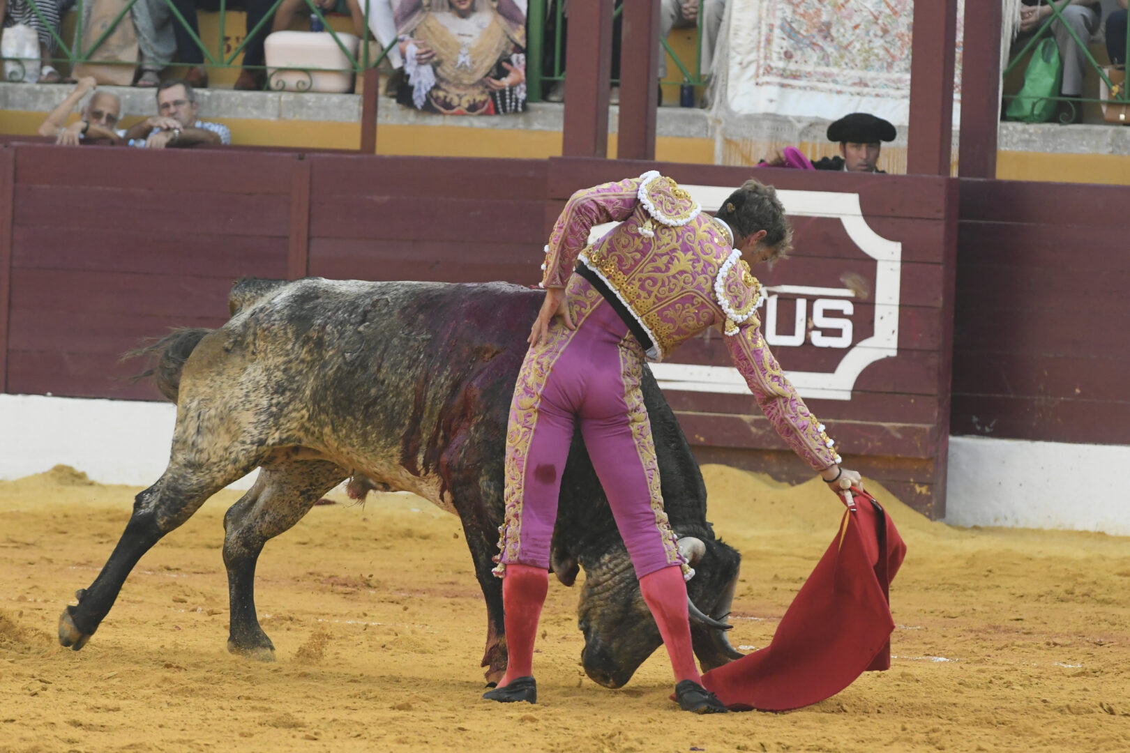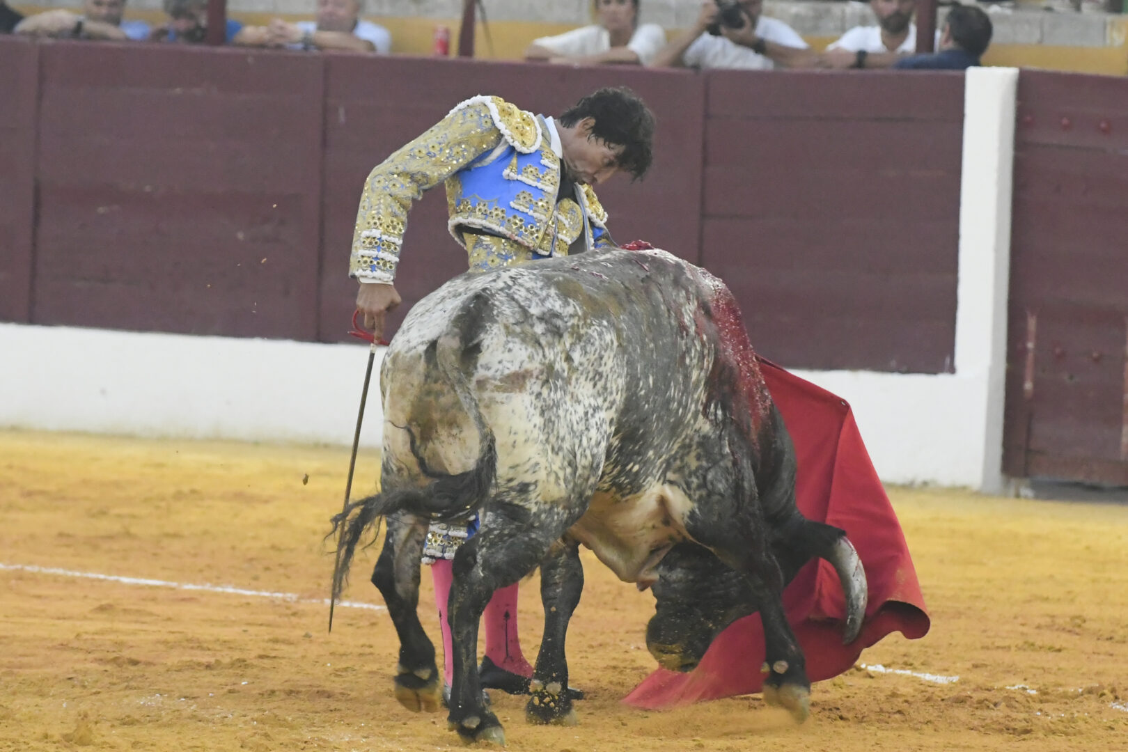 Manuel Escribano, oreja en el único que mató, de carmesí y oro.