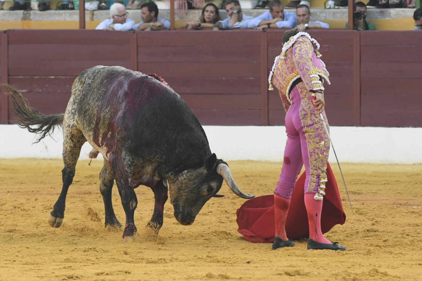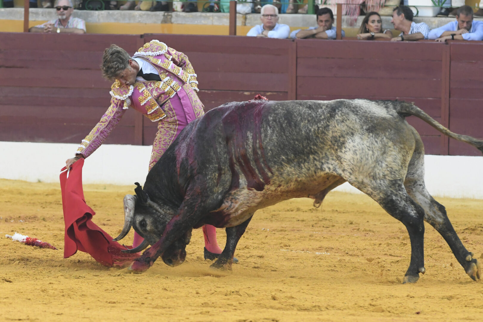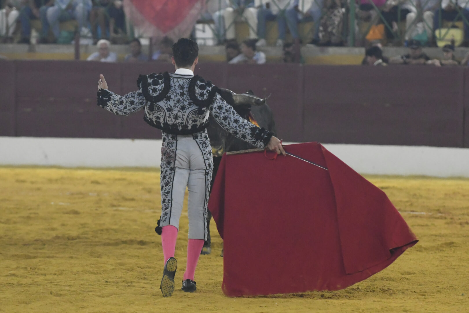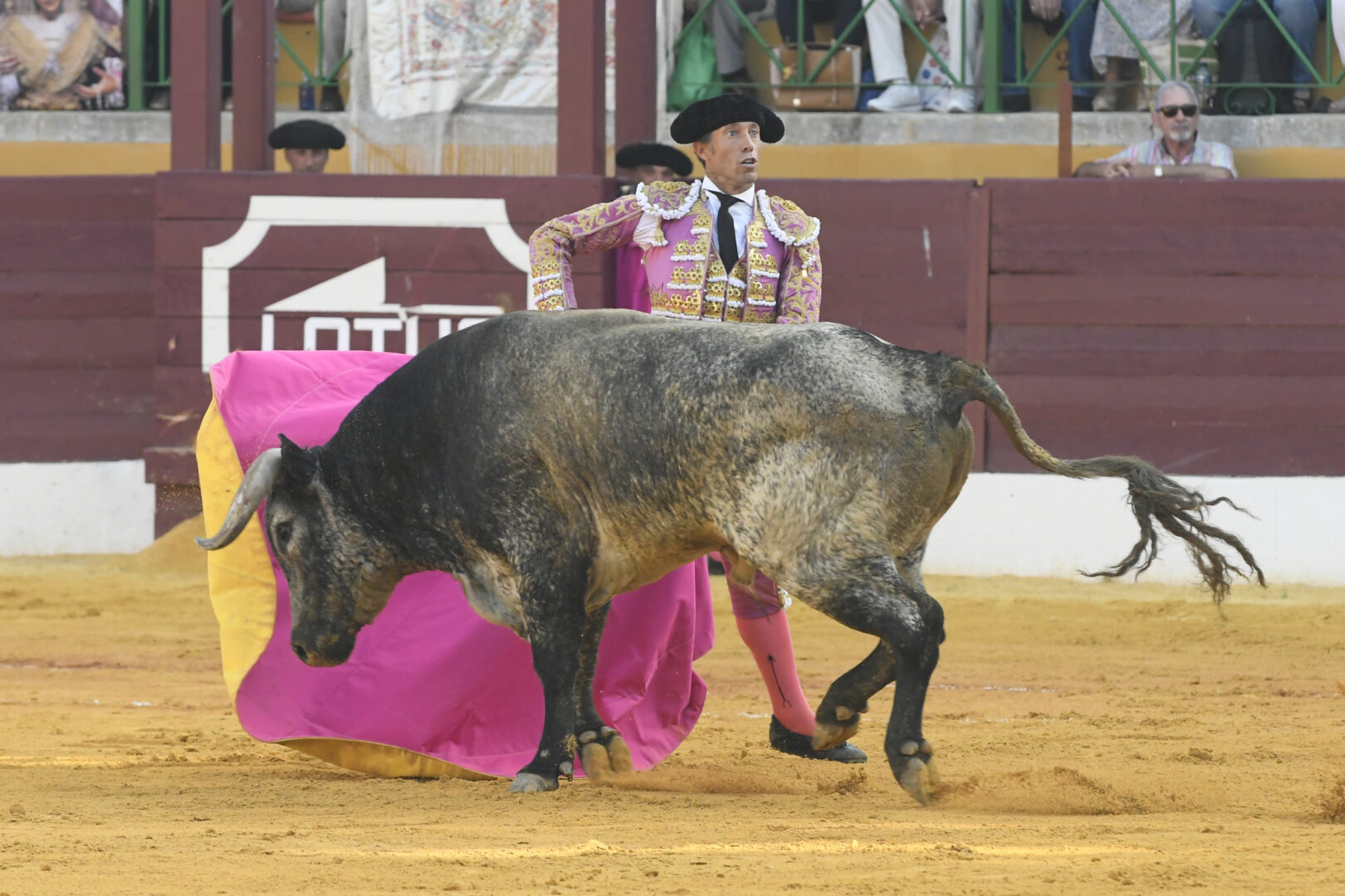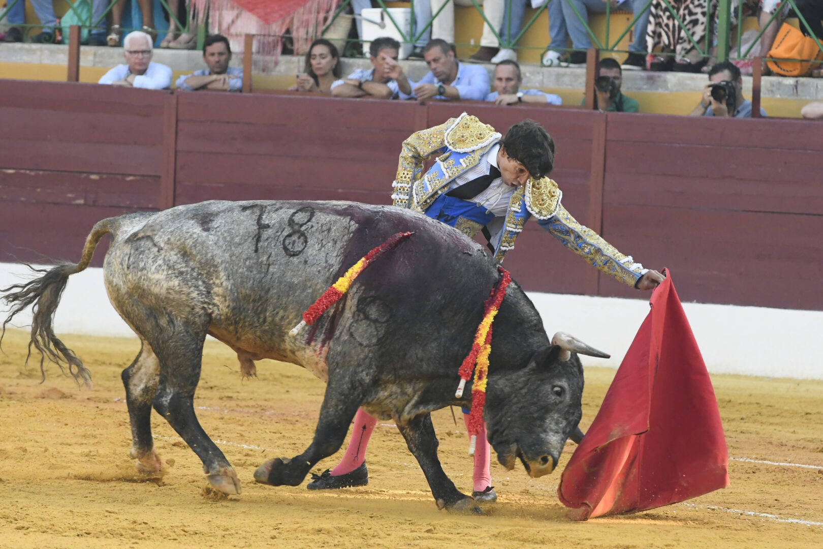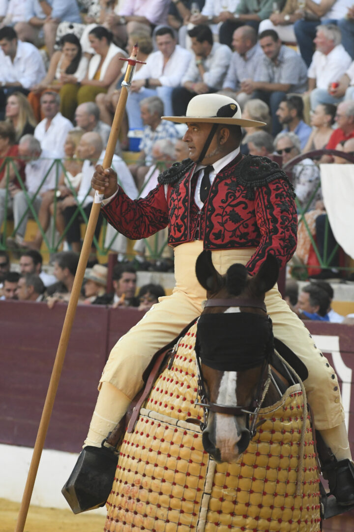 Manuel Escribano, oreja en el único que mató, de carmesí y oro.