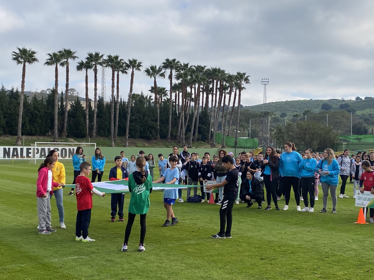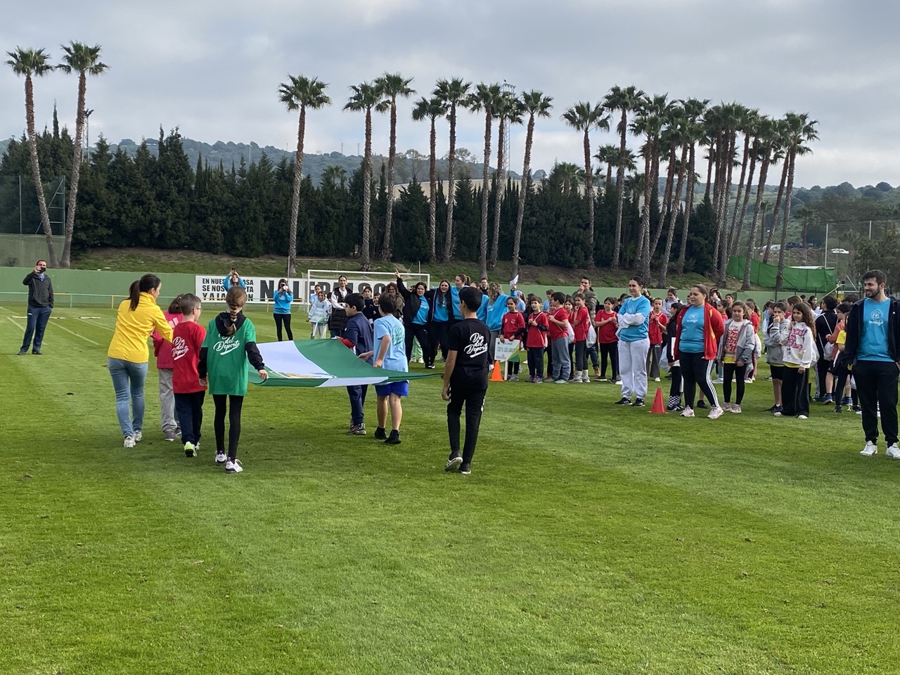 Los chicos y chicas han desfilado alrededor del campo de fútbol “Carlos Piña” del polideportivo San Rafael y, posteriormente, seis de ellos en representación de cada uno de los colegios presentes han porteado la bandera blanca y verde de Andalucía a los sones del himno andaluz.