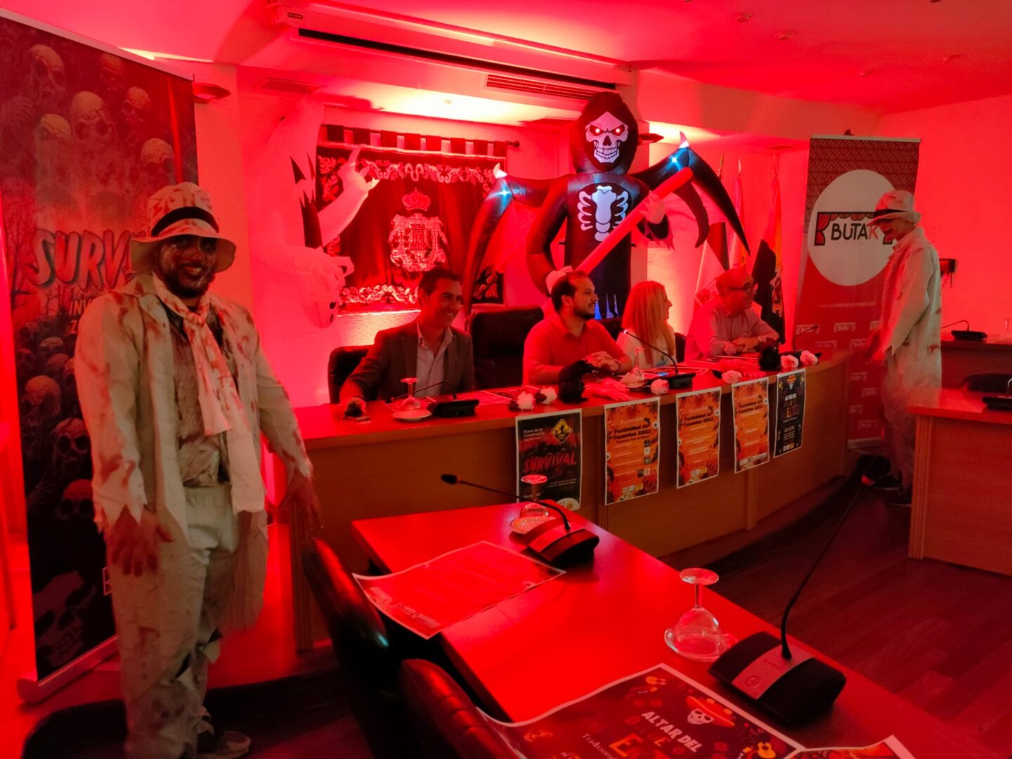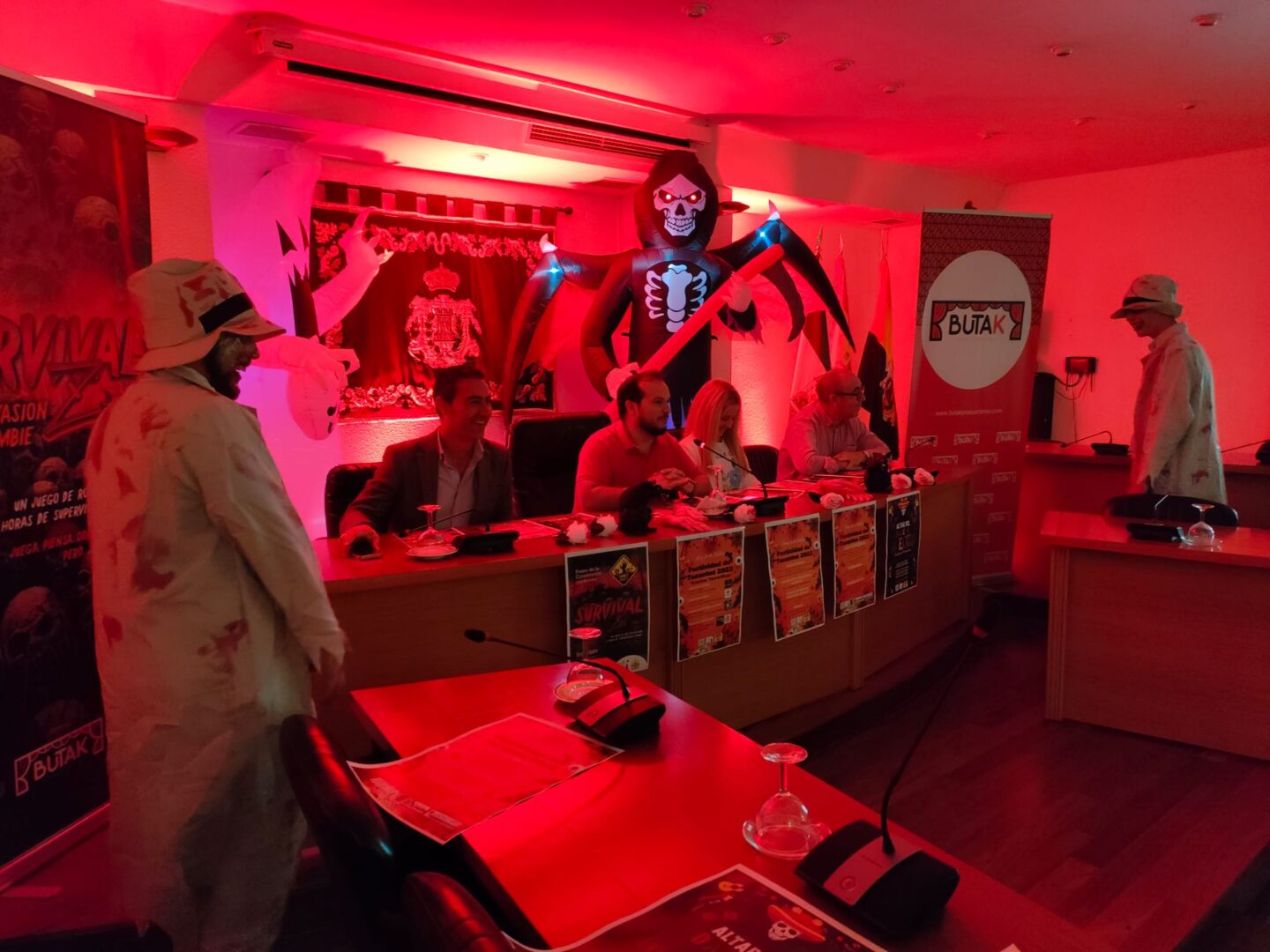 Un salón de plenos que se ha ambientado en una especie de pasaje del terror con una invasión zombie en plena presentación.