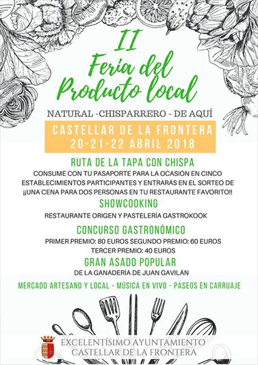 El Ayuntamiento de Castellar de la Frontera organiza la II Feria del Producto Local para el fin de semana del 20, 21, 22 de abril con numerosas actividades con las que promocionar a productores y hosteleros de la localidad. Este año, como novedad, las "Tapas con chispa" servidas por los establecimientos chisparreros que desean participar en la Feria, se convierten en Ruta.