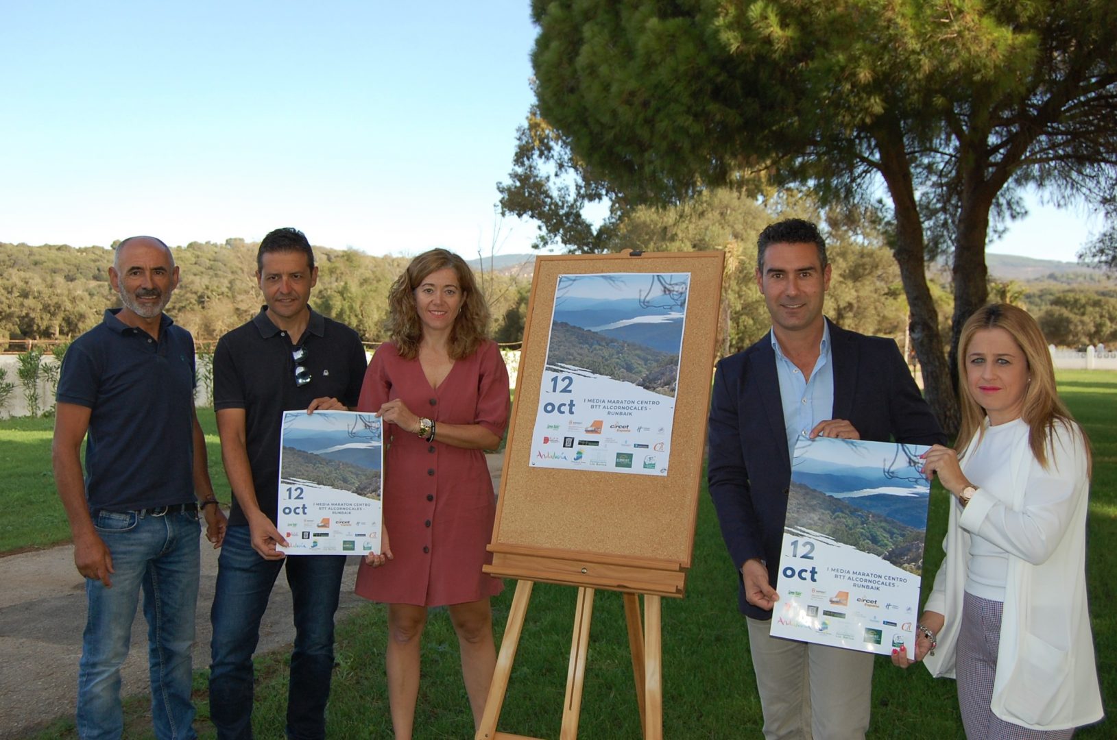 El concejal delegado de Turismo del Ayuntamiento de Los Barrios, Pablo García, junto a la delegada de Deportes, May Gallego, han presentado esta mañana en el Cortijo Soto de Roma, junto a los representantes de Runbaik, empresa organizadora y patrocinadora, el cartel de la I edición de la Media Maratón Centro BTT Los Alcornocales – Runbaik que se celebrará el sábado 12 de octubre.