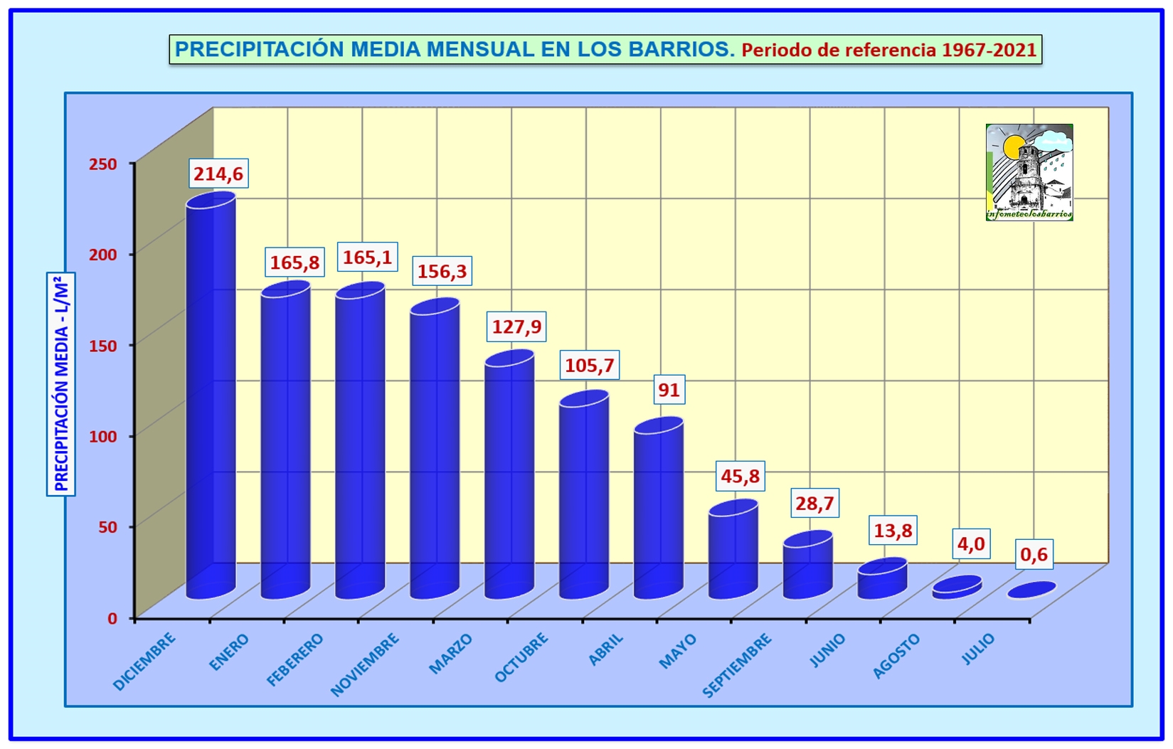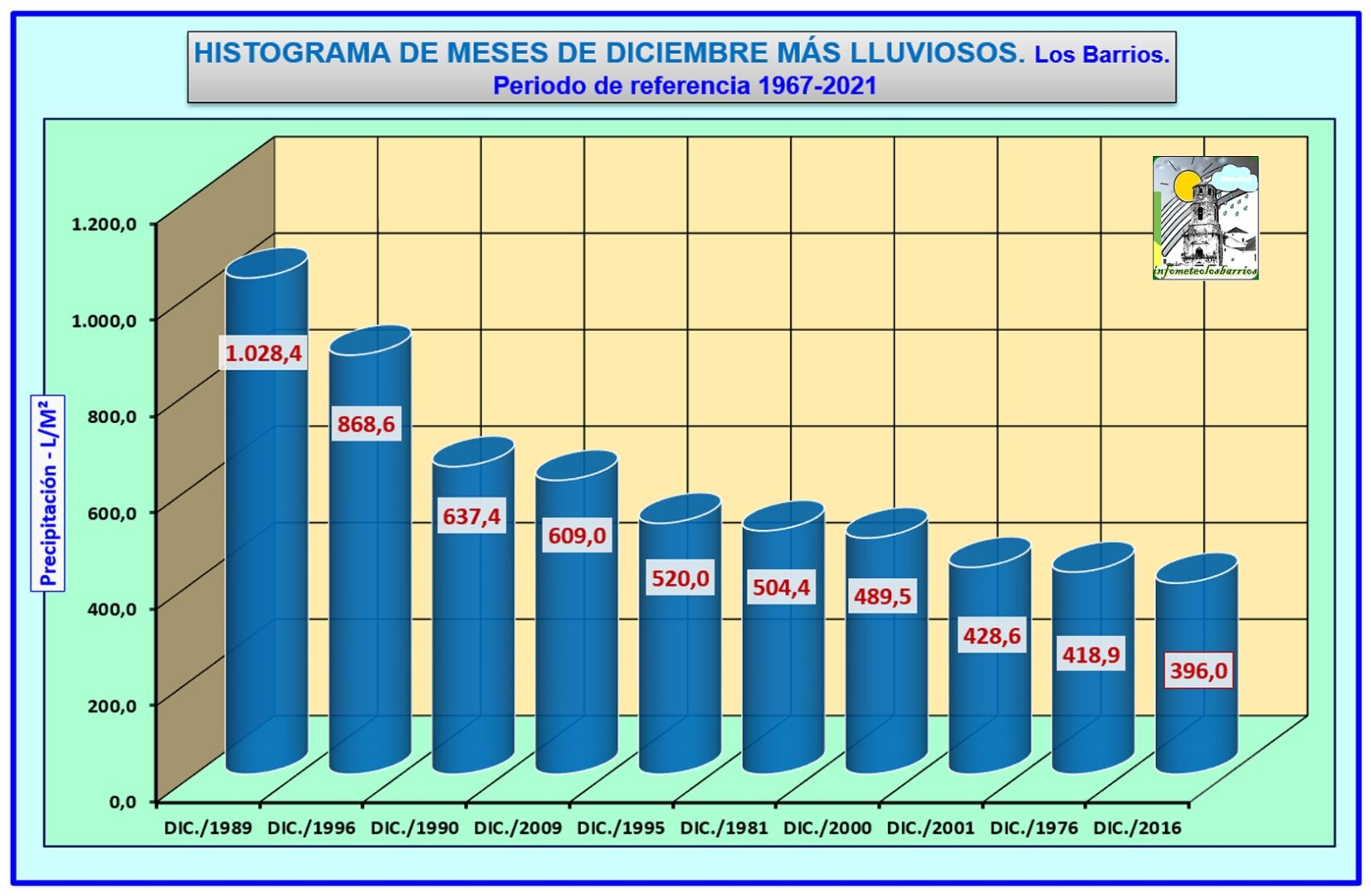 En resumen, no cabe duda que los temporales atlánticos riegan con abundancia esta zona campogibraltareña y los datos climatológicos certifican el carácter lluvioso del mes de diciembre. Hay que hacer constar también, que este perfil tan pluvioso de este último mes del año, va cada año un poco a menos. Desde hace algunos años, las lluvias decembrinas han mermado bastante y ya no se obtienen registros tan importantes. Desde diciembre del año 2009 en el que se registraron 609 mm, los valores han ido disminuyendo progresivamente y la precipitación media para este mes se va reduciendo cada vez más. De todas formas, podemos seguir diciendo por ahora, que diciembre es el mes más lluvioso en Los Barrios con una media general de 214,6 l/m².