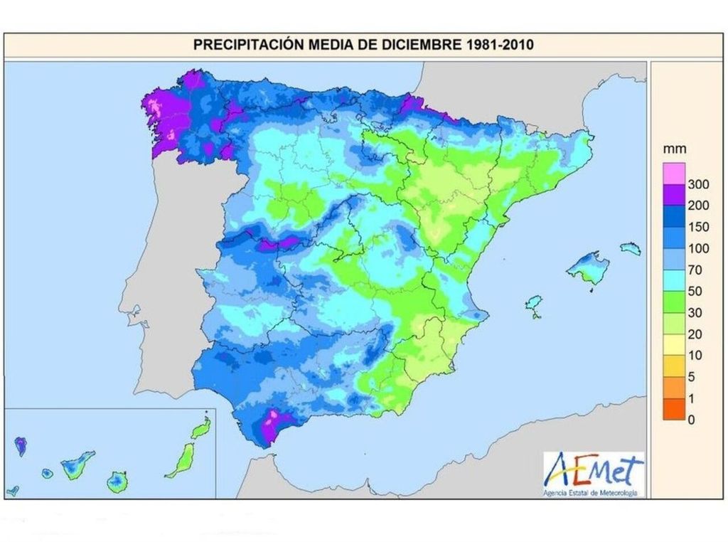 En la mayor parte de la vertiente atlántica peninsular, el paso de profundas borrascas, provocan que haya muchos meses de diciembres pasados por agua y que los valores promedios sean superados con creces en muchos observatorios de las provincias occidentales de Andalucía.