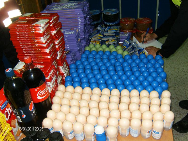 Efectuado el correspondiente registro, los policías encontraron en el maletero del coche frascos de desodorante de diversas marcas, refrescos y una gran cantidad de artículos de alimentación. La marcancía, valorada en unos 800 euros, se hallaba camuflada en dobles bolsas de basura color azul y los dos individuos que la transportaban no pudieron justificar su procedencia.