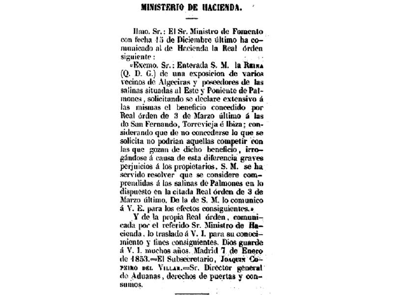Excmo. Sr.; Enterada S.M. La Reina (Q.D.G.) de una exposición de varios vecinos de Algeciras y poseedores de las Salinas situadas al Este y Poniente de Palmones, solicitando se declare estensivo (sic) a las mismas el beneficio concedido por Real Orden de 3 de marzo último a las de San Fernando, Torrevieja e Ibiza; considerando que de no concederse lo que se solicita no podrían aquellas competir con las que gozan de dichos beneficios, irrogándose a causa de esta diferencia graves perjuicios a los propietarios, S.M. se ha servido resolver que se considere comprendidas a las Salinas de Palmones en lo dispuesto en la citada Real Orden de 3 de marzo último. De la de S.M. comunico a V.E. para los efectos consiguientes. Dios guarde a V.E. muchos años. Madrid 15 de enero de 1853. Mirasol. Excmo. Ministro de Hacienda”
