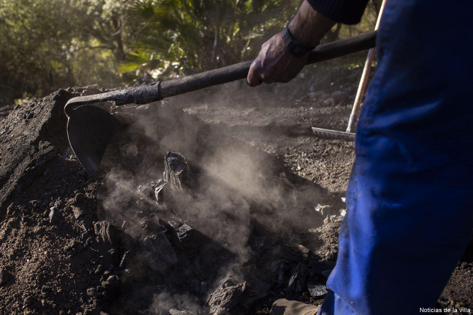 Consiste en un laborioso y complejo proceso que se inicia con el acopio de leña. Se entresacan y podan árboles y ramas, principalmente de acebuche, chaparro, cepas de brezo o quejigo (hasta el año 1964, momento de aparición de la motosierra en nuestro municipio, esta práctica se realizaba con serrote). Posteriormente se forma una base circular (el “alfanje”), en la que se “arma” de forma muy estructurada la leña. Dicha estructura, que forma un montículo semiesférico, se recubre con una capa intermedia de matorral (la“chasca”), principalmente de brezo, helecho o lentisco. Finalmente se “aterra” con una capa externa de tierra recogida en el lugar.